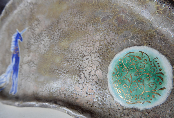 スペイン式の楽焼技法を組み合わせた純銀彩のテクスチャが好きで、