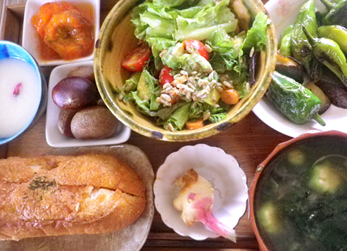 こちらは今朝、農園さんでいただいてきたお野菜たちで朝昼ごはん。