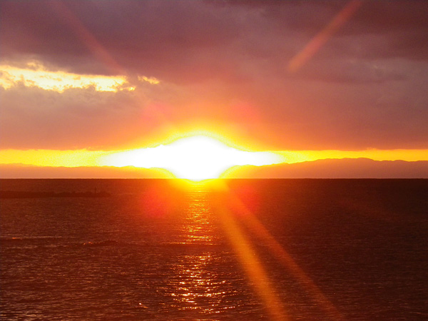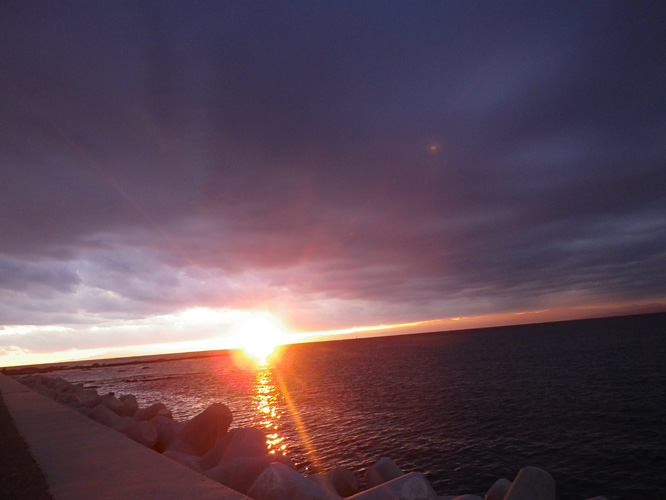 海岸では雲と水平線のほんの狭間の一瞬の日没のドラマを目撃しました。