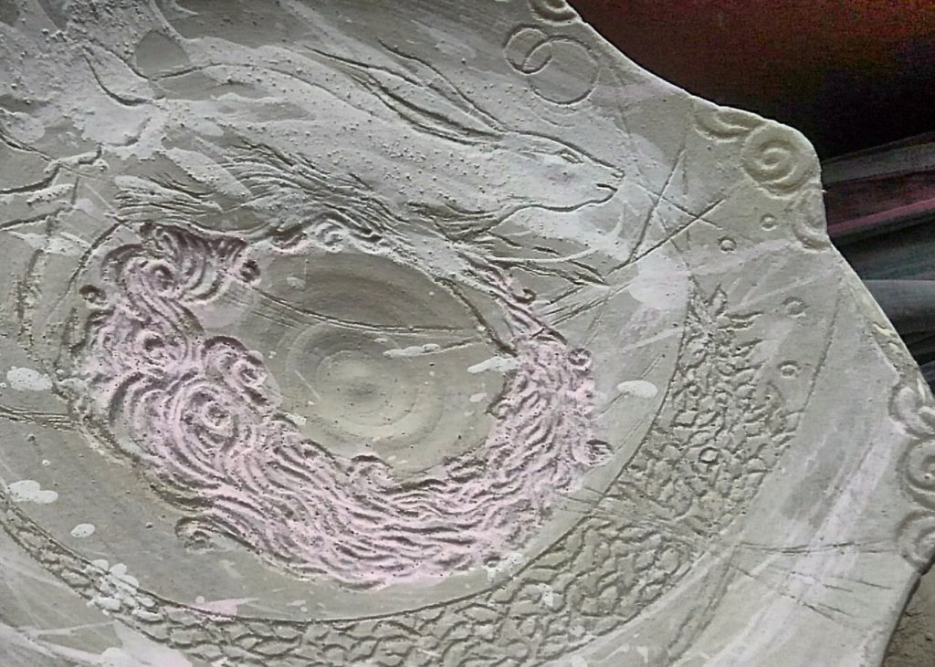 絵付けや釉付けは筆を使うこともありますが、こんな風に草や葉っぱを丸めたり束ねたりした物で付けるのが好き。