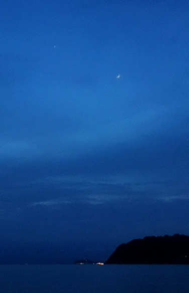 海岸をゆっくりと歩いていたら、おぼろな三日月と金星が姿を見せました。