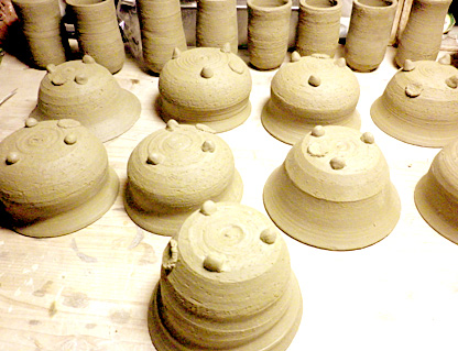 写真は乾燥中の作品たち。現在焼成段階に入っています。