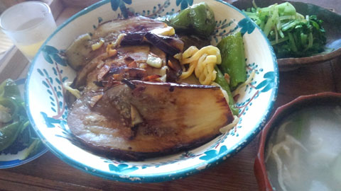 自家製手打ちパスタに採れたての大きな秋ナスのソテー乗せ*