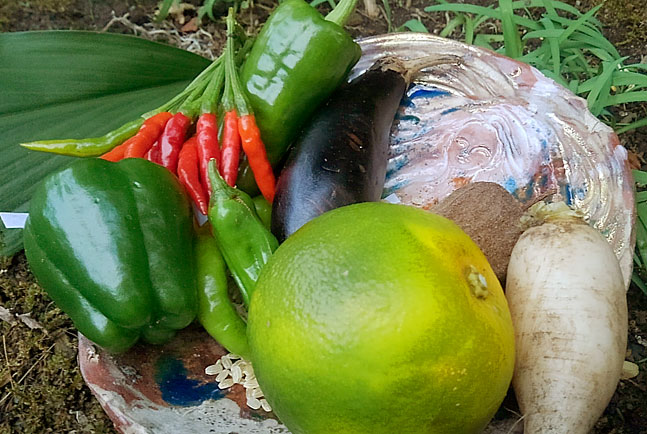 「火を持つセオリツヒメ」のうつわにのせて庭に感謝とともに。