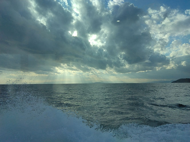波と風が打ち消しあうこの一時間の間なら舟を出せますとの漁船の船長さんのご判断を伝えてくれました。