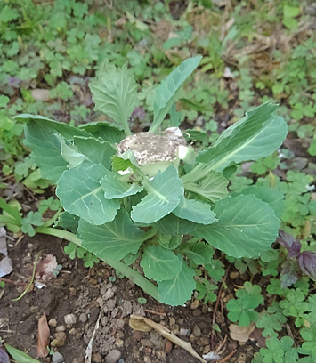 今月初めに食べ終わったキャベツの芯を植えてみました。
